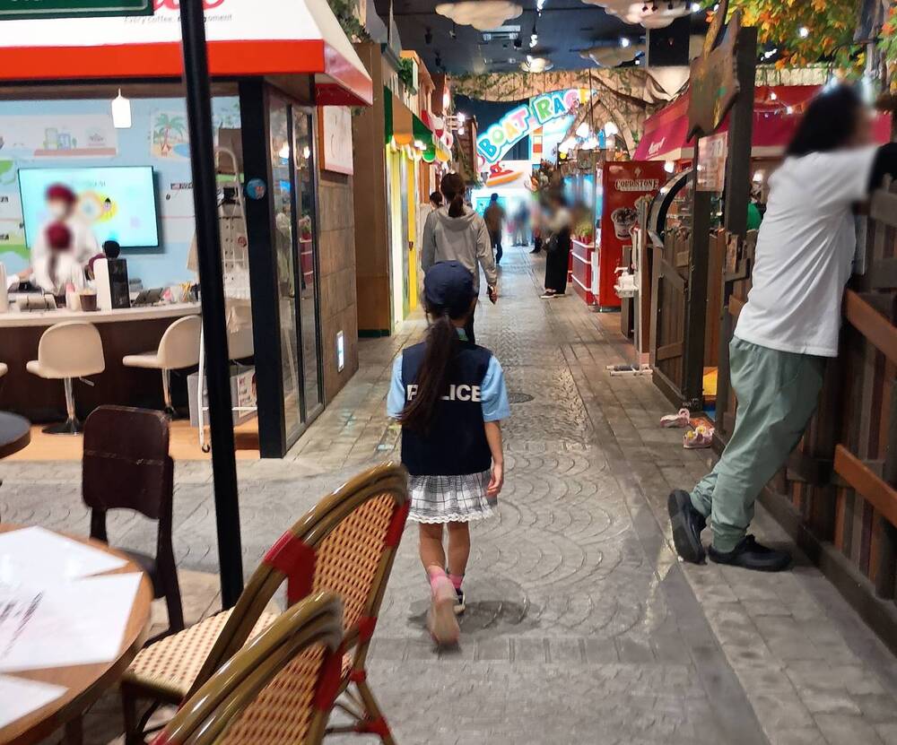 警察官の制服を着て、警察手帳とトランシーバーを持ってパトロールに出発。